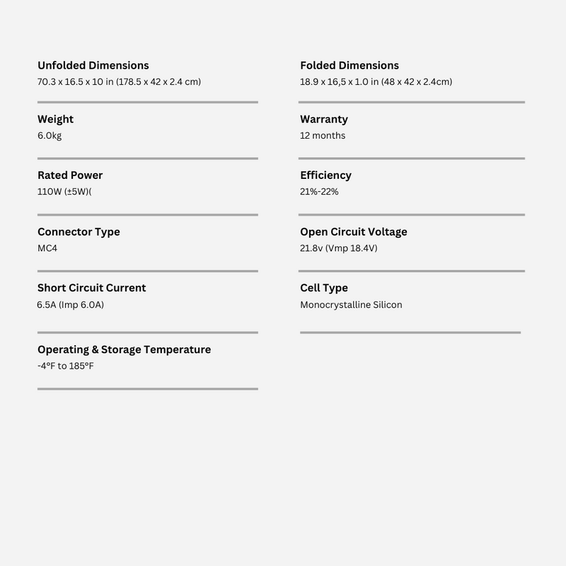 The EcoFlow 110W Foldable Solar Panel is a portable, high-efficiency solution for generating clean energy on the go. Built with premium monocrystalline silicon cells that deliver 22–23% conversion efficiency, it maximizes sunlight capture to provide a stable 110W output—ideal for powering devices or charging portable power stations. With a Voc of 21.8V, Vmp of 18.4V, Imp of 6A, and Isc of 6.5A, it ensures consistent performance even in varying light conditions. The panel is lightweight at only 4 kg and designed with foldable dimensions (42 × 48 × 2.5 cm unfolded, 42 × 178.5 × 2.5 cm folded), making it compact enough to carry while traveling yet powerful enough to support off-grid living. Its integrated protective cover doubles as a kickstand, allowing you to easily adjust the angle to 60° or 90° for optimal sunlight exposure and faster charging efficiency.
