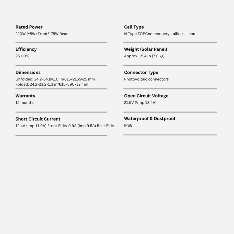 Designed for real-world durability, the EcoFlow 220W Bifacial Solar Panel is IP68-rated, meaning it’s fully waterproof and dustproof for reliable performance in rain, mud, or sandy environments. With an open circuit voltage of 21.5V, front-side short-circuit current of 12.4A, and rear-side current of 9.9A, it delivers efficient and stable energy output that integrates seamlessly with EcoFlow power stations or most third-party systems via standard photovoltaic connectors. Each panel comes with a solar-to-XT60 charging cable included for hassle-free setup, and a 12-month U.S. warranty provides added peace of mind. Whether you’re preparing for an outdoor adventure, boosting your off-grid system, or securing backup power for emergencies, this bifacial solar panel combines cutting-edge solar technology with rugged portability to keep you powered anywhere.