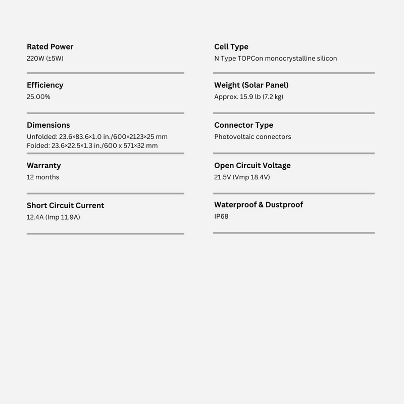 The EcoFlow 220W Lightweight Portable Solar Panel is designed to deliver high-performance, reliable, and portable solar energy wherever you need it. Built with advanced N-Type TOPCon monocrystalline silicon cells, it achieves an impressive 25% conversion efficiency—one of the highest in the industry—so you can generate more power in less time, even in low-light conditions. Its rated power output of 220W (±5W) ensures steady performance, while the integrated solar angle guide and adjustable bracket (30–60°) make it easy to maximize sunlight exposure throughout the day. Lightweight at only 7.2 kg (15.9 lbs) and foldable into a compact 23.6 × 22.5 × 1.3 in. size, it’s ultra-portable, making it perfect for road trips, camping, or as a dependable backup power source at home.