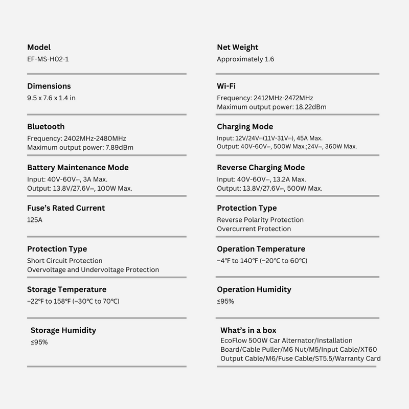 The EcoFlow 500W Alternator Charger delivers up to 5× faster charging in-vehicle outlets, topping up 1kWh in just 2.1 hours. This 3-in-1 device works as a fast charger, battery maintainer, and jump starter for EcoFlow portable power stations. Designed for SUVs, pickups, and RVs, it features easy 3-step installation, robust safety protections, and expands your RV house battery capacity keeping you powered and ready wherever the road takes you.