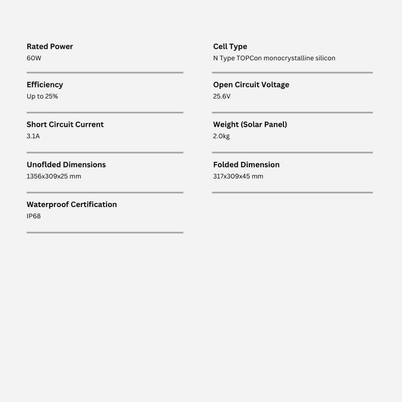 Engineered for durability, the EcoFlow 60W Solar Panel is built with a tough ETFE protective layer and rated IP68 waterproof and dustproof, meaning it’s ready to perform in rain, humidity, or dusty conditions without compromising efficiency. This ensures dependable energy collection even during unpredictable weather. The compact folded size of 38 × 40.2 × 2.5 cm makes it easy to stow away in a backpack or car, while the unfolded size of 103 × 40.2 × 2.5 cm maximizes sunlight capture when in use. With a Voc of 24.5V and Isc of 3.5A, it delivers a stable energy flow to keep your portable power station charged and ready. Backed by a 2-year warranty, the EcoFlow 60W Solar Panel combines portability, efficiency, and durability—making it an ideal companion for outdoor adventures or off-grid living.