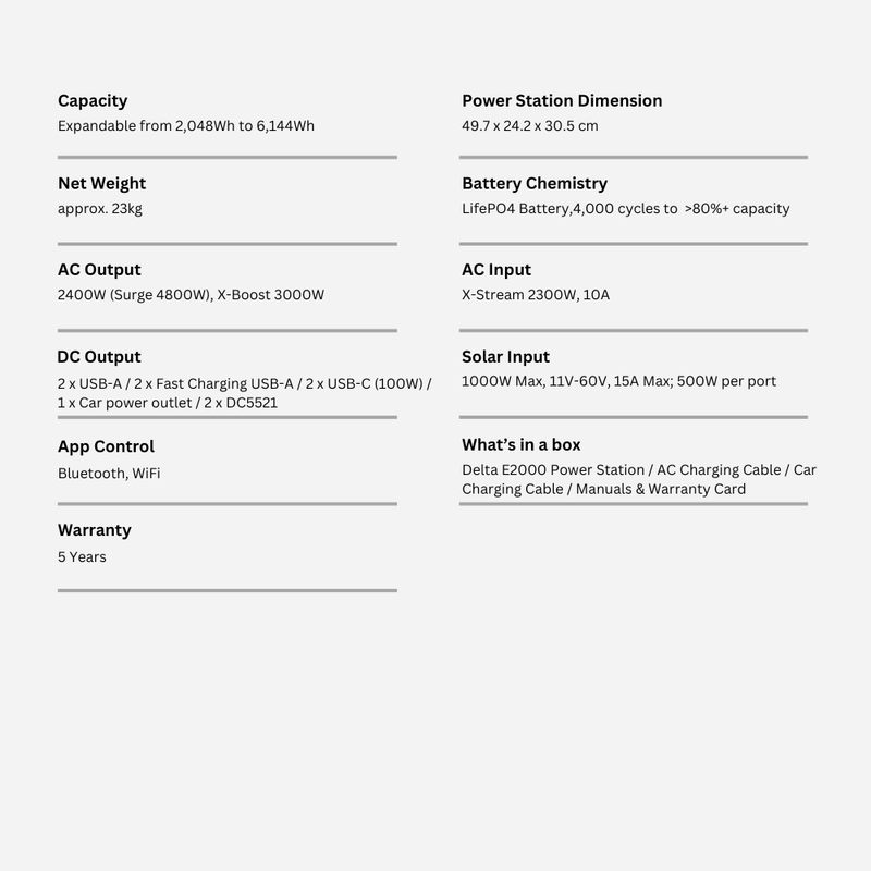 Designed for long-term use, the Delta 2 E2000 features a durable battery that lasts for years and a wide range of outlets and ports to charge multiple devices at the same time. Despite its strong performance, it operates quietly and maintains a compact, portable design. With smart control through the EcoFlow app, you can easily monitor and manage your power usage, giving you confidence, convenience, and dependable energy wherever life takes you.