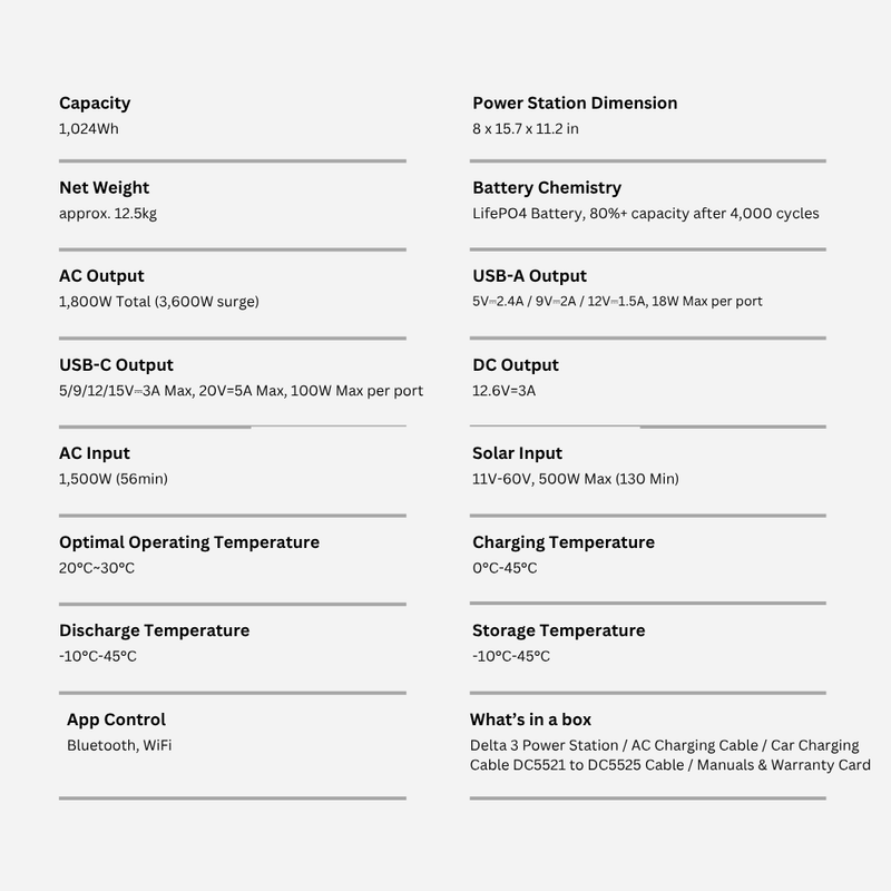 The EcoFlow DELTA 3 Portable Power Station is a high-performance, all-in-one energy solution designed to power everything from home essentials to off-grid adventures. With a powerful 1800W output and expandable capacity from 1024Wh to up to 5kWh, it easily supports high-demand appliances and electronics. Featuring ultra-quiet operation at just 30dB, lightning-fast UPS switching under 10 milliseconds, and a rugged IP65-rated design, the DELTA 3 ensures both reliability and peace of mind in any environment. Its built-in LFP battery delivers up to 4000 cycles for long-term durability, while the 500W solar input provides a sustainable, off-grid charging option.