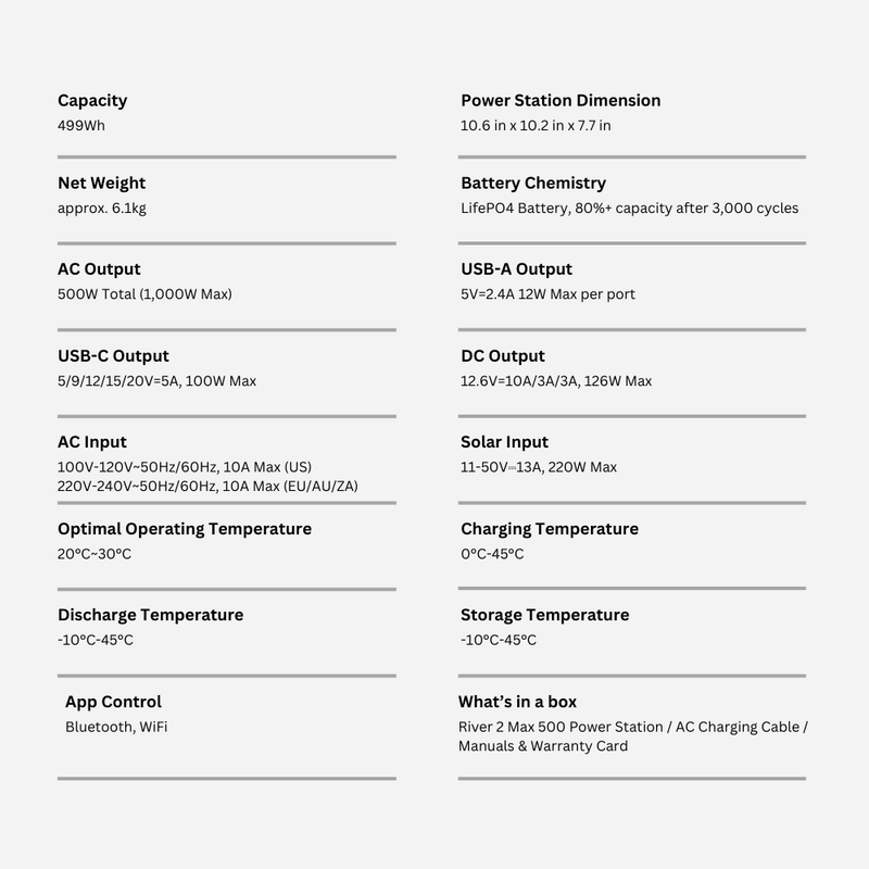 RIVER 2 Max 500: Features a 499Wh battery capacity. RIVER 2 Max 512: Offers a slightly higher 512Wh battery capacity.