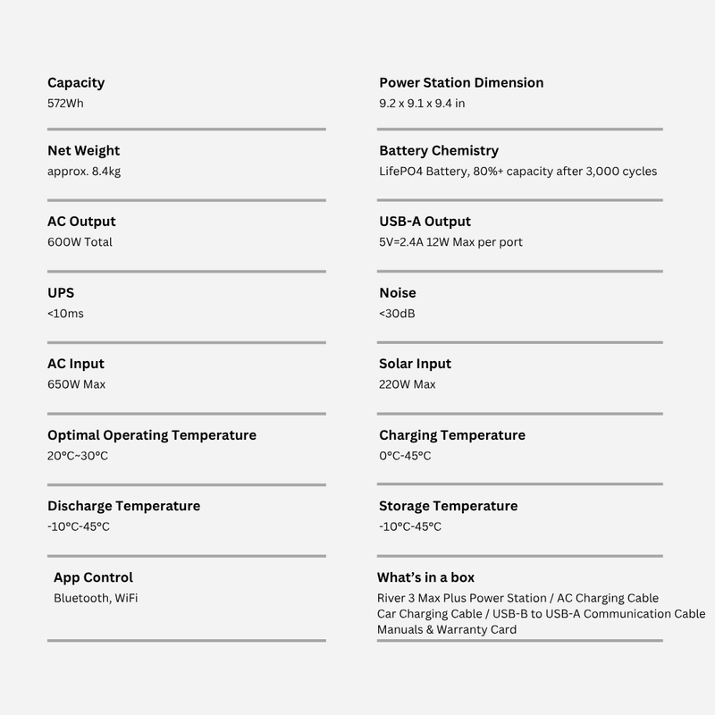 The EcoFlow RIVER 3 Max Plus is a compact and powerful portable power station designed for outdoor enthusiasts, remote professionals, and those seeking reliable backup energy at home. With a base 576Wh capacity expandable to 858Wh using a wire-free 600W additional battery, it offers both convenience and flexibility. Its 600W rated output (surging up to 1200W with X-Boost) can power most household and camping appliances, while its pro-grade UPS ensures seamless operation for sensitive electronics like computers and medical devices with a switching time of under 10 milliseconds.