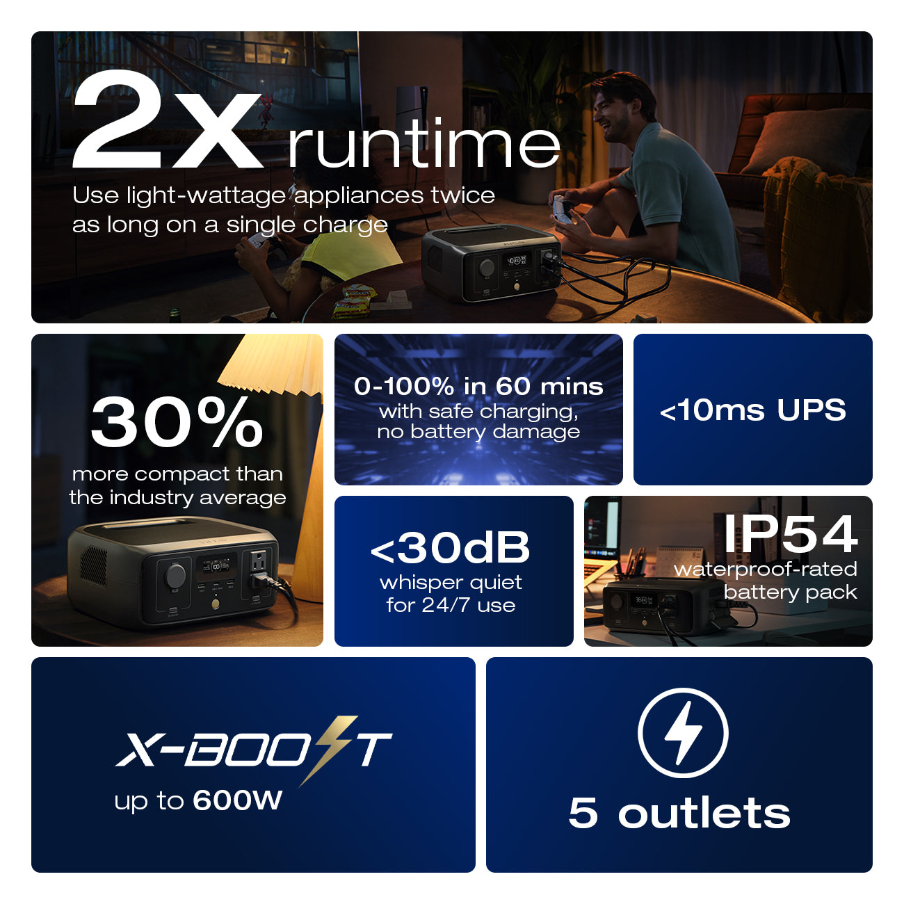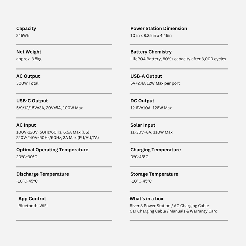 - Built with advanced LiFePO4 battery technology, the RIVER 3 offers up to 3,000 charge cycles while maintaining 80% of its original capacity, ensuring long-term durability and performance. Fast 1-hour charging gets you back to full power quickly, and the built-in EPS functionality (<20ms switching) protects your sensitive devices during power interruptions. With safety-focused features, optimized runtime for low-wattage devices, and dependable performance packed into a small form, the EcoFlow RIVER 3 is a practical and versatile portable power station you can count on anywhere.