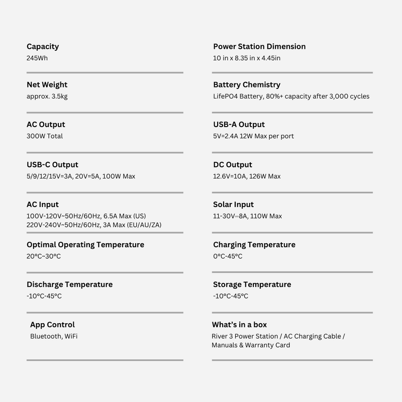 - Built with advanced LiFePO4 battery technology, the RIVER 3 offers up to 3,000 charge cycles while maintaining 80% of its original capacity, ensuring long-term durability and performance. Fast 1-hour charging gets you back to full power quickly, and the built-in EPS functionality (<20ms switching) protects your sensitive devices during power interruptions. With safety-focused features, optimized runtime for low-wattage devices, and dependable performance packed into a small form, the EcoFlow RIVER 3 is a practical and versatile portable power station you can count on anywhere.
