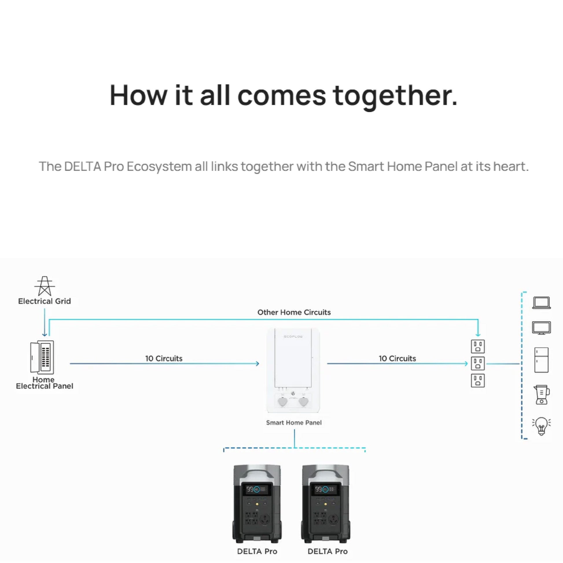 This panel isn't just for grid-tied applications—it can also function in fully off-grid setups, delivering centralized energy to your home or essential devices. Installation is made simple with included relay modules, mounts, and connectors, and it’s fully compatible with solar integration through the DELTA Pro’s 1600W, 11–150V DC solar input. With robust app control and high Power Output: The Smart Home Panel enables a maximum output power of 3600W with 21.6 kWh capacity when combined with DELTA Pro and 2 Extra Batteries