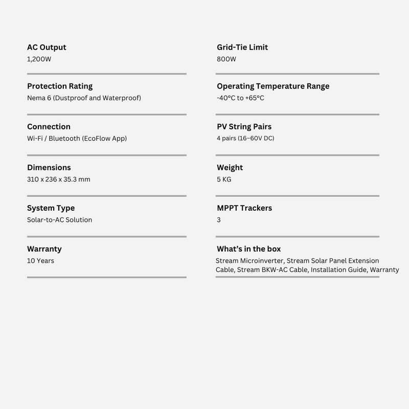 The EcoFlow STREAM Microinverter is a compact yet powerful solar-to-AC solution designed for efficient home energy optimization. Supporting up to 1,200W PV input across 3 MPPTs and 4 PV string pairs (16–60V DC), it delivers a stable 1,200W nominal AC output with an 800W grid-tie limit, ensuring maximum solar utilization and savings. Engineered with NEMA 6 dustproof and waterproof protection, it performs reliably in extreme temperatures ranging from -40°C to +65°C, using passive cooling for silent, maintenance-free operation.