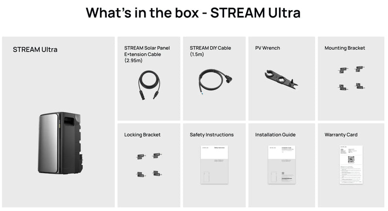 Designed for convenience and flexibility, it supports AC charging up to 1,050W, AC output up to 1,200W, and even allows you to feed up to 800W back to the grid. It operates ultra-quietly (<30dB), offers IP65/NEMA4 weather protection, and weighs only 23.1kg, making installation simple and hassle-free. Complete with all necessary accessories—solar extension cables, AC cable, PV wrench, and mounting brackets—and backed by a 10-year warranty, the STREAM Ultra gives you a reliable, space-saving, and future-ready solar power solution for your home.